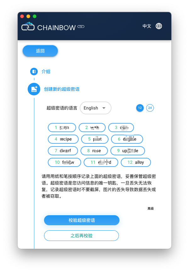 创建时,可以选择中日英等各国语言的助记词,助记词分为12位和24位。