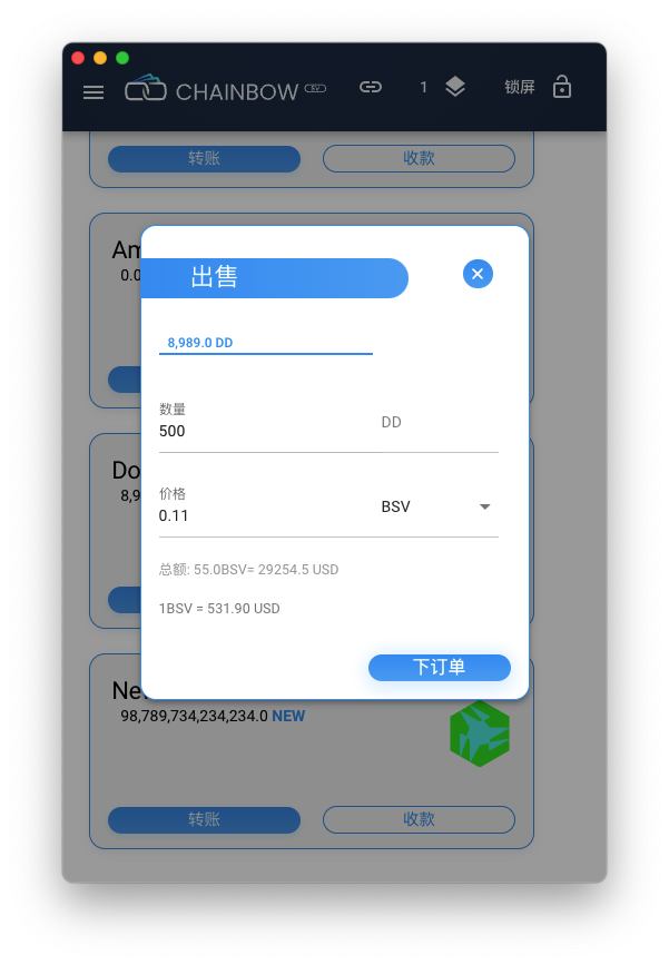 选择销售菜单,输入出售的数量和每个Token单位价格,下订单之后,订单将在 侧边栏-订单 页面显示,你可以随时取消订单。