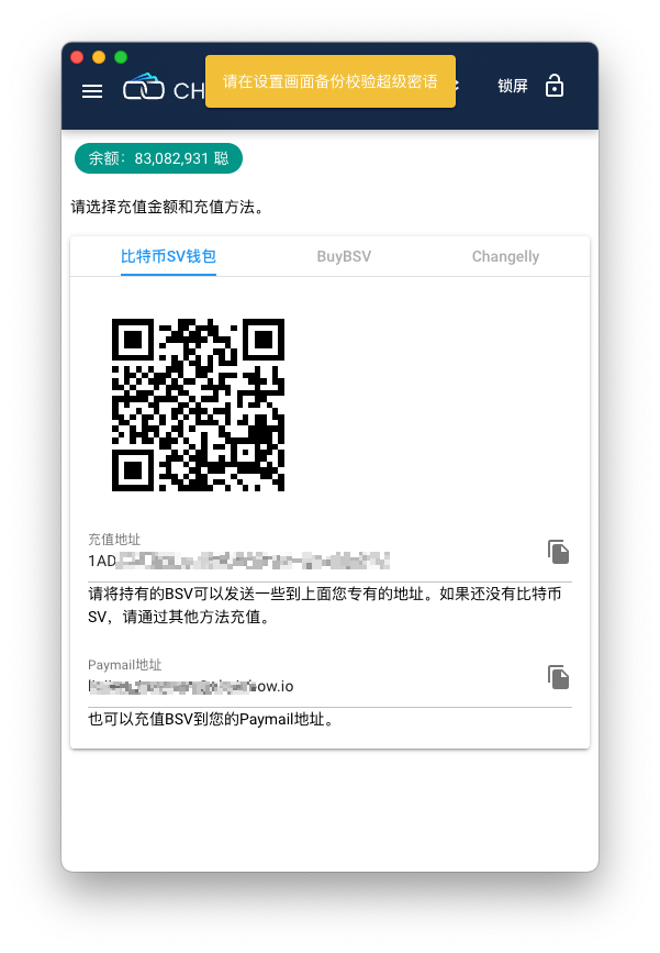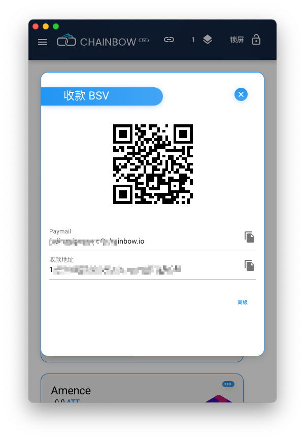 2.点击主界面BSV卡片的接收按钮,将显示你的地址和二维码。从其他钱包或者交易所转入一些BSV(注意:钱包只支持BSV,不要转入其他币种)。