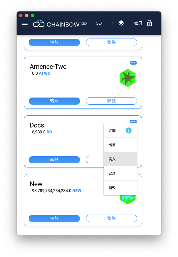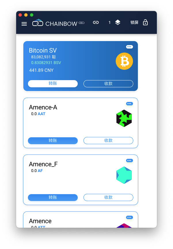 回到主画面会显示刚才创建的Token,你可以转账Token给他人,只需要对方ChainBow的比特币地址或者Paymail地址。