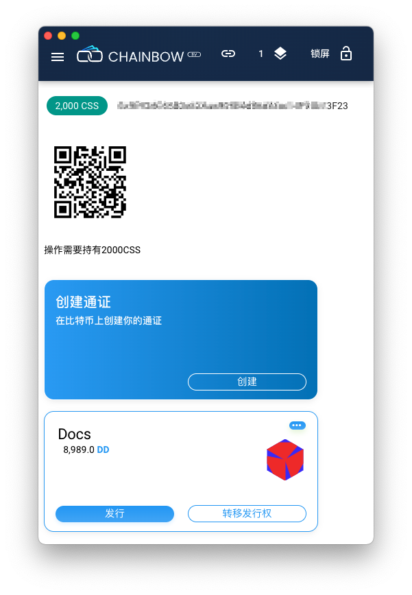 1.发币需要持有一定数量的CSS ERC20 Token。在高级页面顶部你可以看到一个以太坊地址和二维码。转入提示数量的CSS到此地址。点击CSS余额刷新,到账后就可以创建比特币Token。购买 CSS