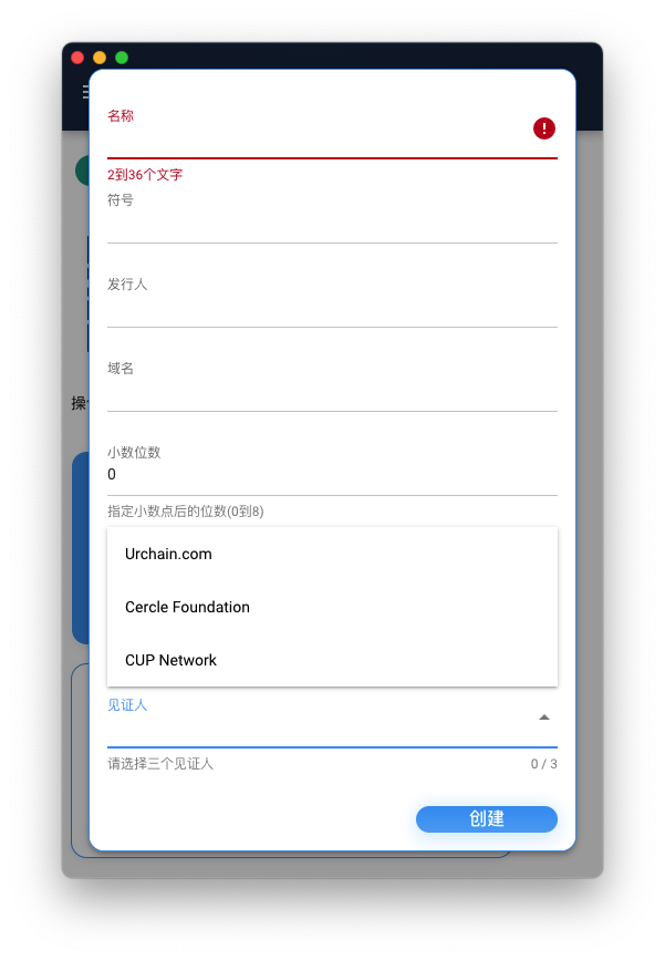 3.最后:在CSS余额足够情况下,点击创建通证按钮,输入Token的名字,简称,域名,发行人,初始的发行量,未来的发行量上限,以及小数点后几位小数。 名字和简称可以是中英日文。域名和发行人说明什么人对此Token持有法律责任。小数点后的位数,表明你的Token可以精确到多少位,比如3.12,那小数位数是2。首次发行的数量,以及未来最大的供给量(填写0代表可以无限增发)。然后选择三位见证人。见证人将从比特币网络外部观察你的Token是否存在伪造。